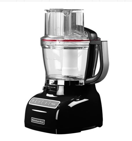 KitchenAid Food Processor Black. Comes complete with a 3.1L mixing bowl and 950ml mini-mixing bowl, lid with extra-wide feed tube, 2 speeds 900-1750 rpm, and pulse button. The food processor comes standard with 3 blades, slicing and grating discs, egg beater, spatula, and a convenient storage box.