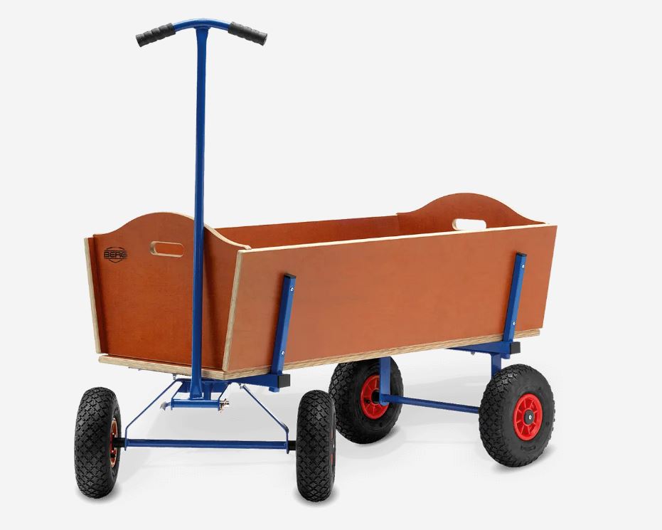 The BERG handcart is indispensable at any campsite or family park. It's designed to transport children and goods easily, safely, and comfortably. Thanks to its robust design and high quality, the handcart rides very smoothly and will last for years. This sturdy handcart is made of wood.Equipped with incredibly strong tires and roller bearings for a comfortable ride on any surface. The tires have a special tread pattern for sufficient grip. Safe, super strong, and virtually indestructible.The steel frames are finished with high-quality, extremely durable paint to protect the steel from rust and external influences. The body is made of water-resistant and virtually indestructible wood.The handcart is easy to disassemble, making it easy and compact to transport or store.