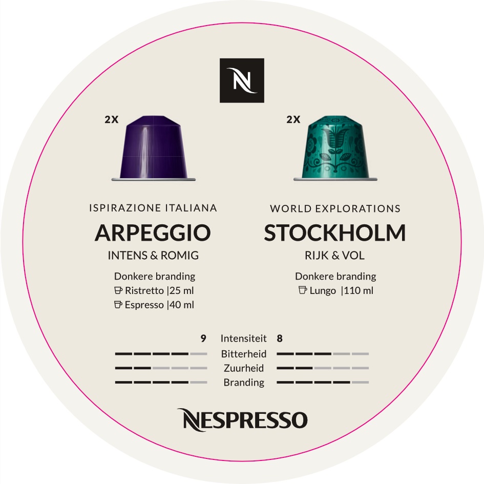 Coffee/Tea Package with Nespresso Cups. Contents: 4x Coffee Cups for Nespresso, 4x Tea Bags, 4x Milk, 4x Sugar. Packaged in a Marindex coffee boxLees meer