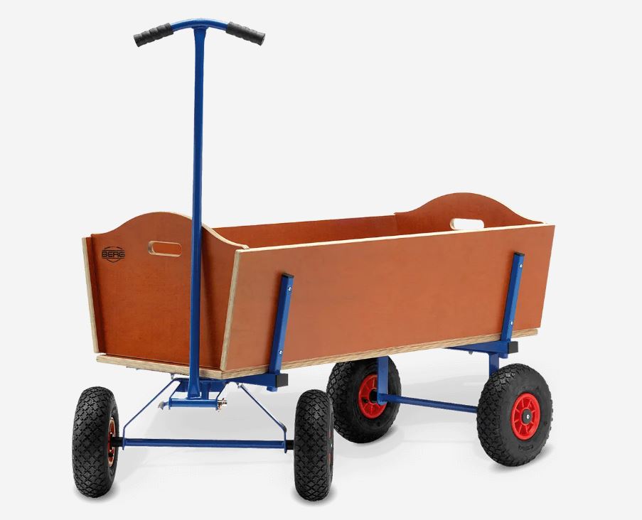 The BERG handcart is indispensable at any campsite or family park. It's designed to transport children and goods easily, safely, and comfortably. Thanks to its robust design and high quality, the handcart rides very smoothly and will last for years. This sturdy handcart is made of wood.Equipped with incredibly strong tires and roller bearings for a comfortable ride on any surface. The tires have a special tread pattern for sufficient grip. Safe, super strong, and virtually indestructible.The steel frames are finished with high-quality, extremely durable paint to protect the steel from rust and external influences. The body is made of water-resistant and virtually indestructible wood.The handcart is easy to disassemble, making it easy and compact to transport or store.