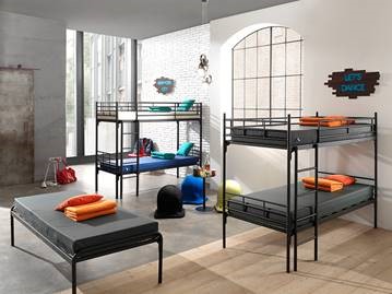 Bunk bed 80x200 blackThe bunk bed is of a simple but very strong construction. The solidity is tailored to use in the leisure market. The model is easy to convert into two 1-person beds, by removing the intermediate pieces. The bed base (Trasmad) consists of heavy side rails, which is connected to 8 strong transverse supports. On top of that lies a braided wire mesh, which is attached all around to the steel frame by spot welding. A literally iron-strong bed base. Standard included are bed ladder and fall protection gate.Outside dimensions: 86x206x160H